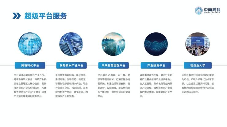 中南高科,紧跟“制造强国”战略和“一带一路”倡议,以新兴产业园区发展为基 础,以产业资源导入与产业发展服务为核心竞争力,全力赋能优秀企业与企业家,致力于打造集产业研究策划、园区开发、产业资源导入及产业园综合运营服务于一体的服务中国制造业的平台。